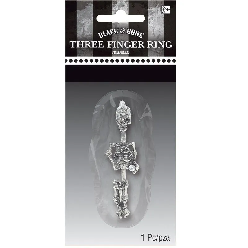 Le squelette semble couché sur les trois anneaux et tient dans sa main gauche un strass. Le bijou est de couleur argentée.