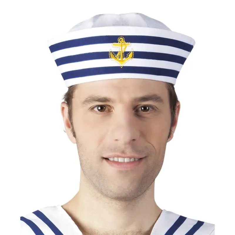 Pour une soirée navy avec vos amis, complétez votre déguisement avec ce joli béret de marin en tissu blanc rayé bleu. Il sera du plus bel effet avec sa petite encre jaune brodée sur le devant.