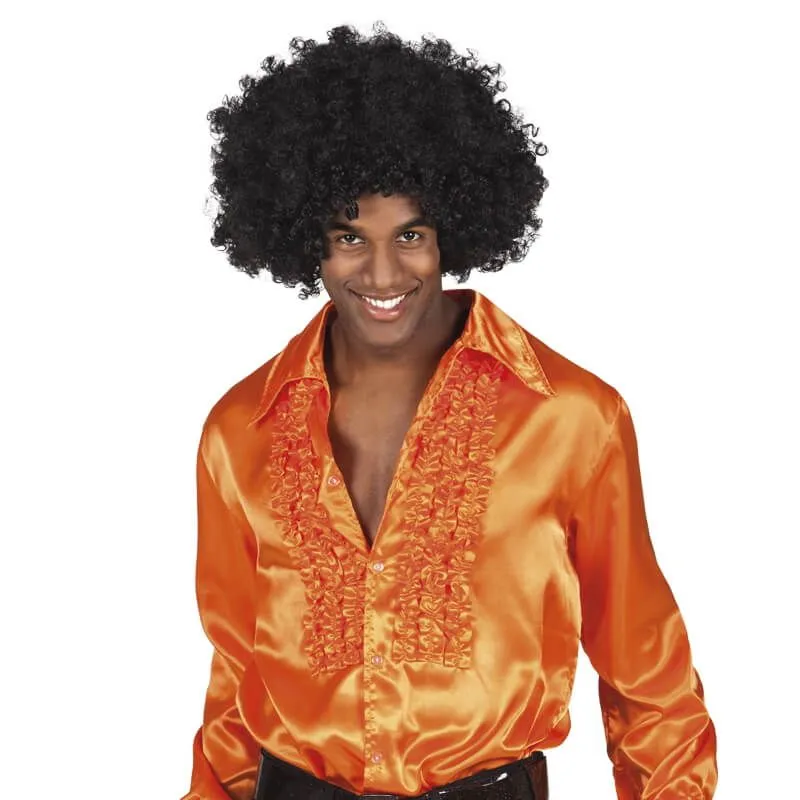 Cette chemise disco pour homme est réalisée dans un tissu satiné. Des froufrous sont présents de part et d’autre du boutonnage de la chemise. Elle se ferme à l’avant par des boutons en plastique transparent.