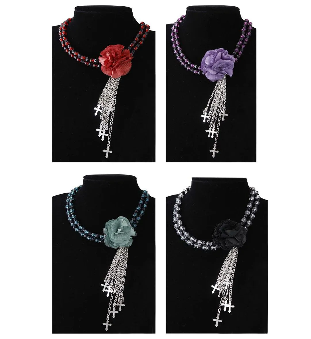 Cet ensemble collier fleur ras le cou gothique comprend le collier en perle, la fleur gothique et 5 petites croix gothiques qui pendent.