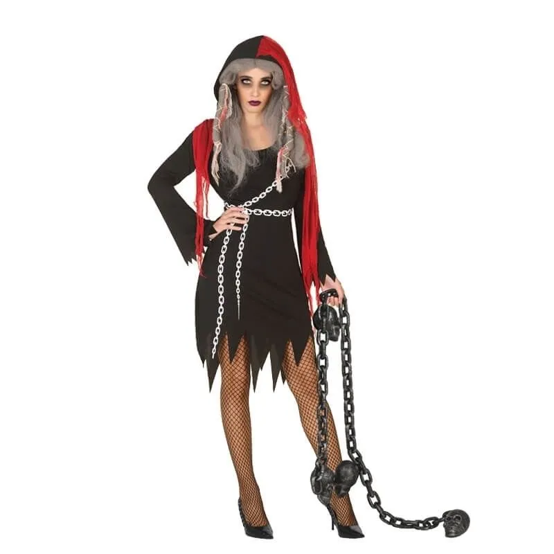 Ce déguisement de maîtresse des enfers comprend la robe rouge et noire avec les chaînes dessinées dessus et la capuche.