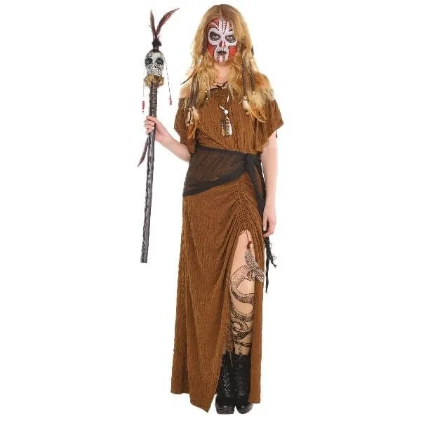 Le déguisement comprend une robe longue de couleur marron fendue de mi-cuisse jusqu’en bas et à manches courtes. Grâce à la coulisse partant de la taille vous pouvez ajuster la longueur de celle-ci avec la cordelette passée à l’intérieur. Cette cordelette est maintenue à ses extremités par des perles de têtes de mort et une plume dans les mêmes tons qui apportent une touche de féminité à ce costume. Le déguisement est accompagné d’une ceinture a nouer soi-même sur un côté de la taille.