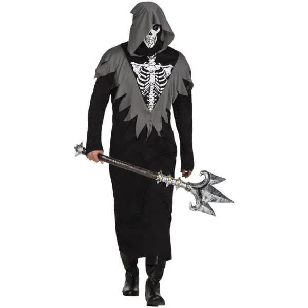 Ce déguisement de gardien de la mort annonce l’ambiance de votre soirée : parfait pour effrayer vos invités ! Avec ce costume de squelette faucheur vous serez le maître de la soirée. Un dessin de la cage thoracique est imprimé sur le torse de la tunique noire et un empiècement gris en dents de scie, de forme triangulaire, borde le dessin des épaules jusqu’au milieu de la colonne vertébrale. La capuche est fixée au costume et est de couleur grise pour s’accorder parfaitement à l’ensemble.