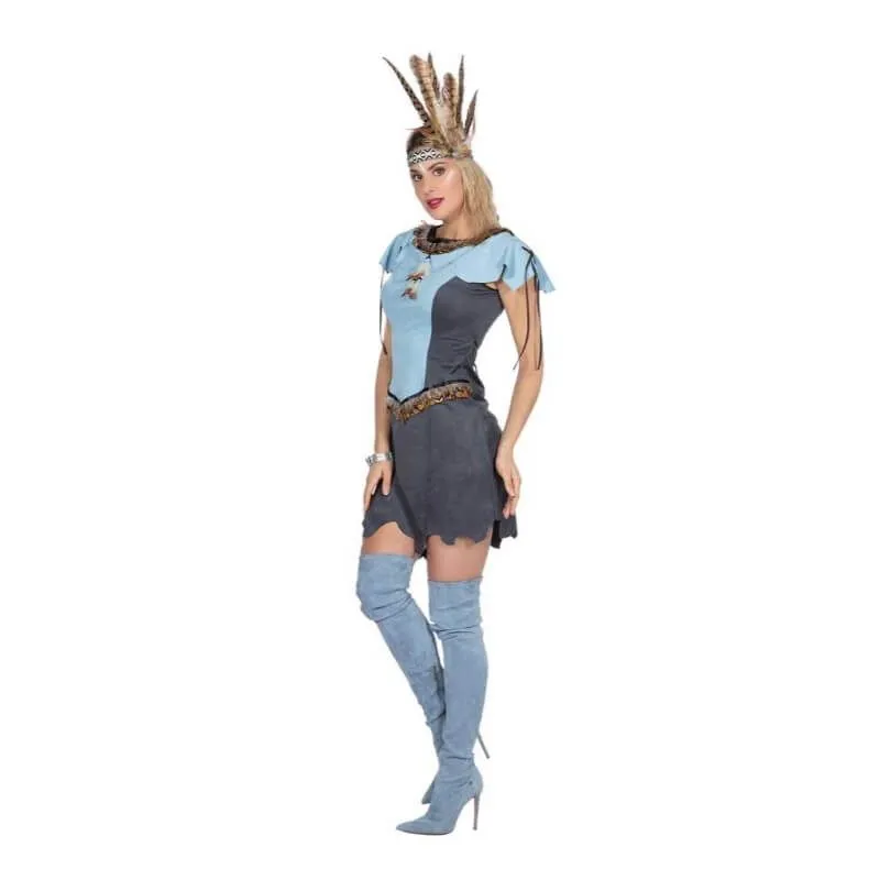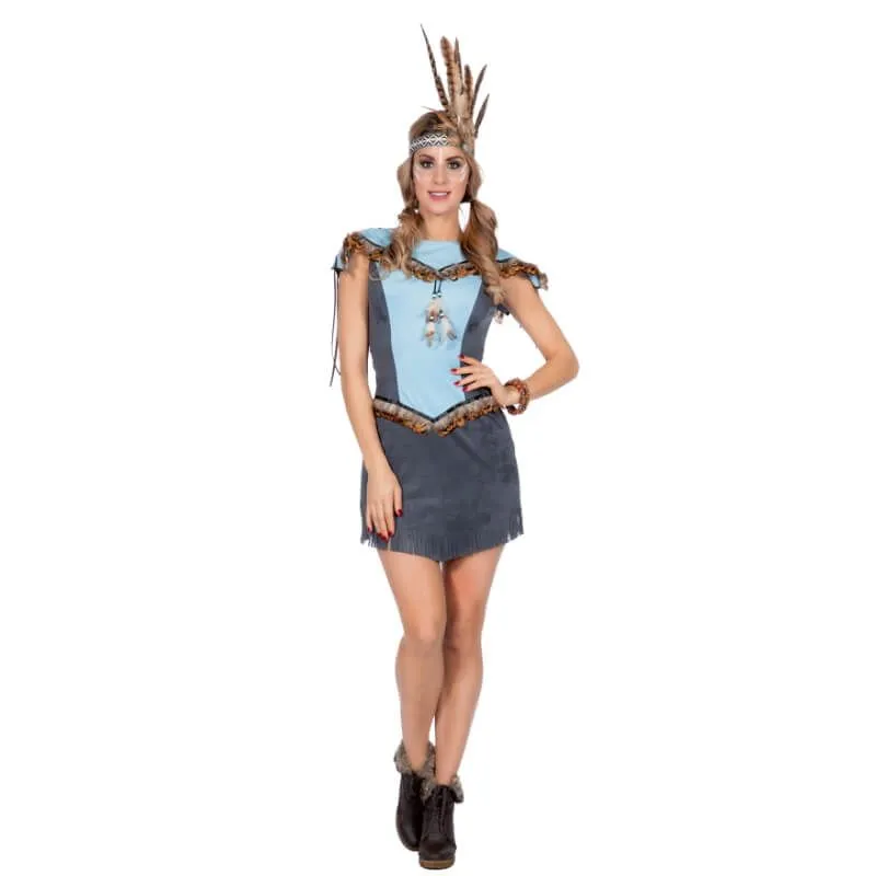 Ce splendide costume de qualité supérieure d’indienne vous transformera immédiatement en une véritable peau-rouge, une parfaite squaw ! Ce déguisement comprend une robe dans des teintes de gris et de bleu avec un liseré marron. On retrouve des plumes au niveau du col et de la taille ainsi qu’un collier cousu avec des perles et des plumes. Les extrémités des manches et de la robe sont à franges.