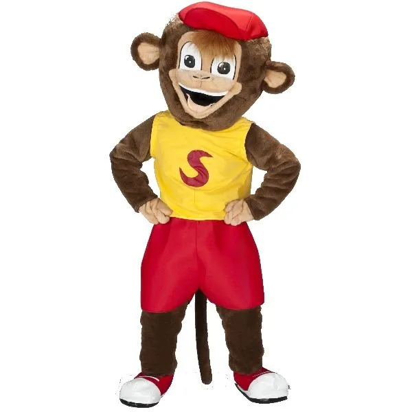 Déguisement mascotte en peluche composé du corps en peluche avec T-Shirt Jaune et short rouge intégré, queue de singe, mains de singe en fourrure et baskets à ajuster sur vos propres chaussures. Tête de chimpanzé rigolo avec casquette rouge intégrée!